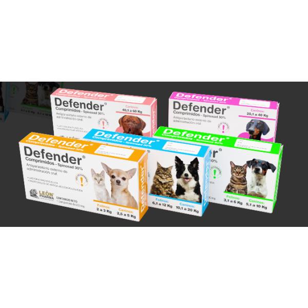 DEFENDER PALATABLE DE 10.1 A 20 KG PERROS Y GATOS DE 6.1 A 12 KGSDefender ComprimidosAntiparasitario externo pulguicida de rápida acción.Categoría:AntiparasitariosDescripciónSpinosad 30%.Antiparasitario externo pulguicida de rápida acción.Comprimidos masticables.Administrar justo después de la alimentación.