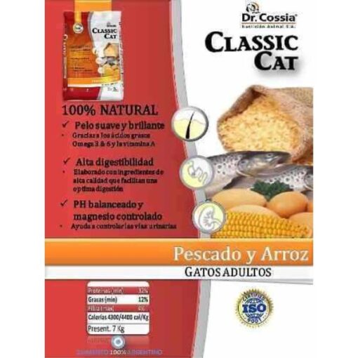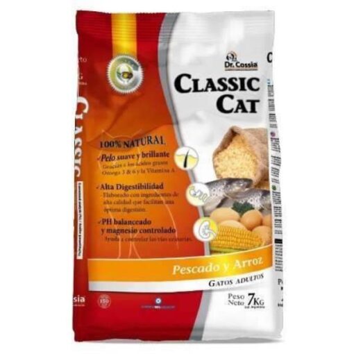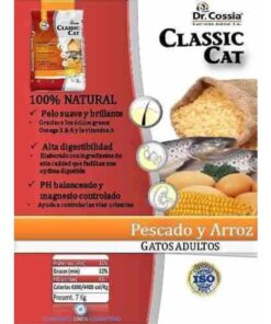 Dr. Cossia Classic Cat está formulado con harina de pollo, para darle un irresistible sabor, sus ingredientes de primera calidad y alto valor nutricional hacen que Dr. Cossia Classic Cat pueda suministrarse a gatos de todas las edades y razas sin el agregado de suplementos.100% natural, satisfacción garantizada y sabor irresistible. • Fortificado con vitaminas y minerales: para una sana vida y óptima estructura ósea. • Omega 3: para un pelo sedoso y brillante. • Alto valor nutricional a un precio accesible. • pH balanceado y magnesio controlado. Ingredientes: Harina de pollo, aves y vísceras, arroz, maíz, afrechillo de trigo, pellets de soja, grasa de pollo, aceite de pescado. Vitaminas: A, B1, B2, B6, B12, D3, C y E. Acido nicotínico, pantotenato de calcio, colina y ácido fólico. Minerales: cloruro de sodio, carbonato de calcio, yodato de calcio, selenito de sodio, carbonato de cobalto, antioxidantes y conservantes. Aminoácidos: ácido fosfórico, taurina, metionina y lisina.