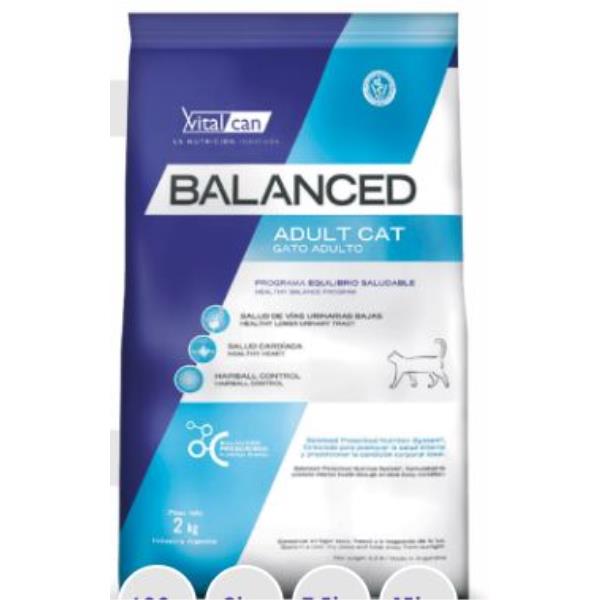 Proteinas 30% Grasa 12% Vitalcan Balanced es ideal para gatos adultos porque su Programa Equilibrio Saludable les proporciona:Salud de vías urinarias bajas: formulado con bajos niveles de minerales -especialmente magnesio- que ayudan a evitar la formación de cristales yo cálculos urinarios. Regula el pH urinario.Salud cardíaca: posee taurina y L-carnitina que favorecen al músculo cardíaco colaborando en la prevención de cardiomiopatías.Hairball Control: el agregado de celulosa ayuda a prevenir la formación de bolas de pelo en el tracto gastrointestinal por efectos del lamido.IngredientesHarina de pollo arroz gluten meal maíz harina de soja micronizada aceite de pollo trigo hidrolizado proteico de pollo pulpa de remolacha (fuente de fructooligosacáridos FOS) aceite de pescado levadura de cerveza sal celulosa en polvo bisulfato de sodio metionina lisina zeolita inulina vitaminas: A D3 E K3 B1 B2 B6 B12 biotina ácido fólico ácido nicotínico ácido pantoténico vitamina C minerales inorgánicos (iodato de calcio sulfato ferroso óxido manganoso) minerales quelados (cobre como metioninato de cobre selenio como levadura enriquecida zinc como propionato de zinc) cloruro de potasio taurina sorbato de potasio nucleótidos de levadura colina paredes de levadura (fuente de manano-oligosacáridos MOS) extracto de Yucca schidigera antioxidantes (extracto de romero BHA BHT) y polifenoles